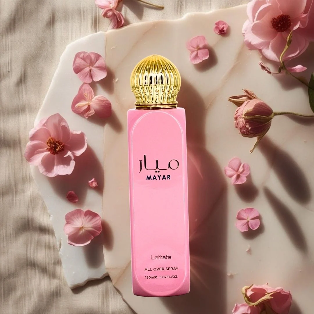 Mayar All Over Spray, da Lattafa, abre com uma mistura suculenta e vibrante de framboesa, lichia e groselha preta. O coração floresce com a delicada elegância da rosa e da magnólia, criando um buquê floral suave.