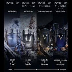 A quintessência de Invictus Victory. A fragrância viciante da vitória. O frescor aumenta o lavandim aromático da Provença, com a picada do cardamomo verde e o crocante da pimenta preta.  No escuro, o incenso misterioso se mistura com a opulência amadeirada do patchouli Indonésio. O delicioso néctar do licor de fava tonka adiciona profundidade e elegância a uma deliciosa overdose da fava de baunilha, originais de Madagascar.